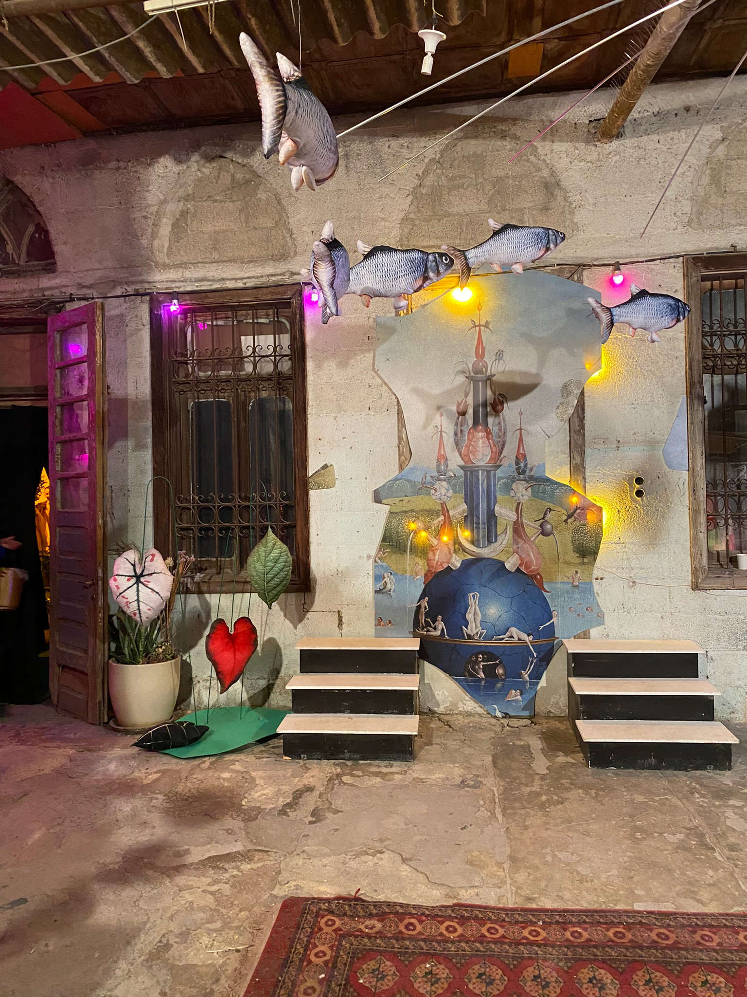 התאורה אינה חזקה ושומרת על נינוחות ונעם. היא משולבת בחללים כך שכל חלל משליך על האחר. היא מייצרת צללים וסילואטות על הקירות מהאובייקטים ומהשחקנים בתנועה. לדוגמא הדגים בחלל הראשי מטילים צל על הקיר המואר עם הגרילנדה של הציור וגם בגיהינום נוצרים גוונים יפיפיים מהצל. יש הרבה דברים מאוד ססגוניים שאפשר לעשות עם אור אבל דווקא עניין אותי הנוכחות הטבעית המייצרת אזורים של חושך, צל וההשתקפויות של האובייקטים השונים בחפיפה ביניהם.
